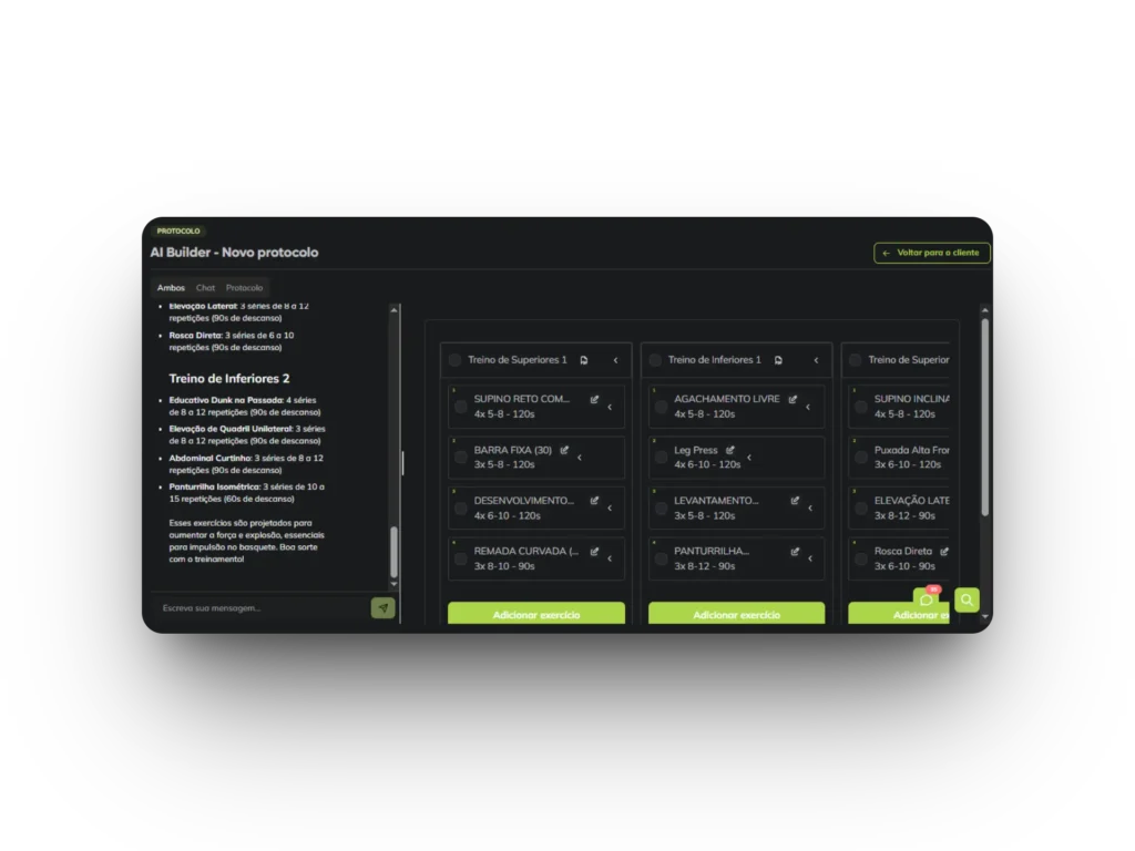Recupere o tempo de estruturação de protocolos de treinos sem perder a qualidade de entrega. Monte treinos em segundos.